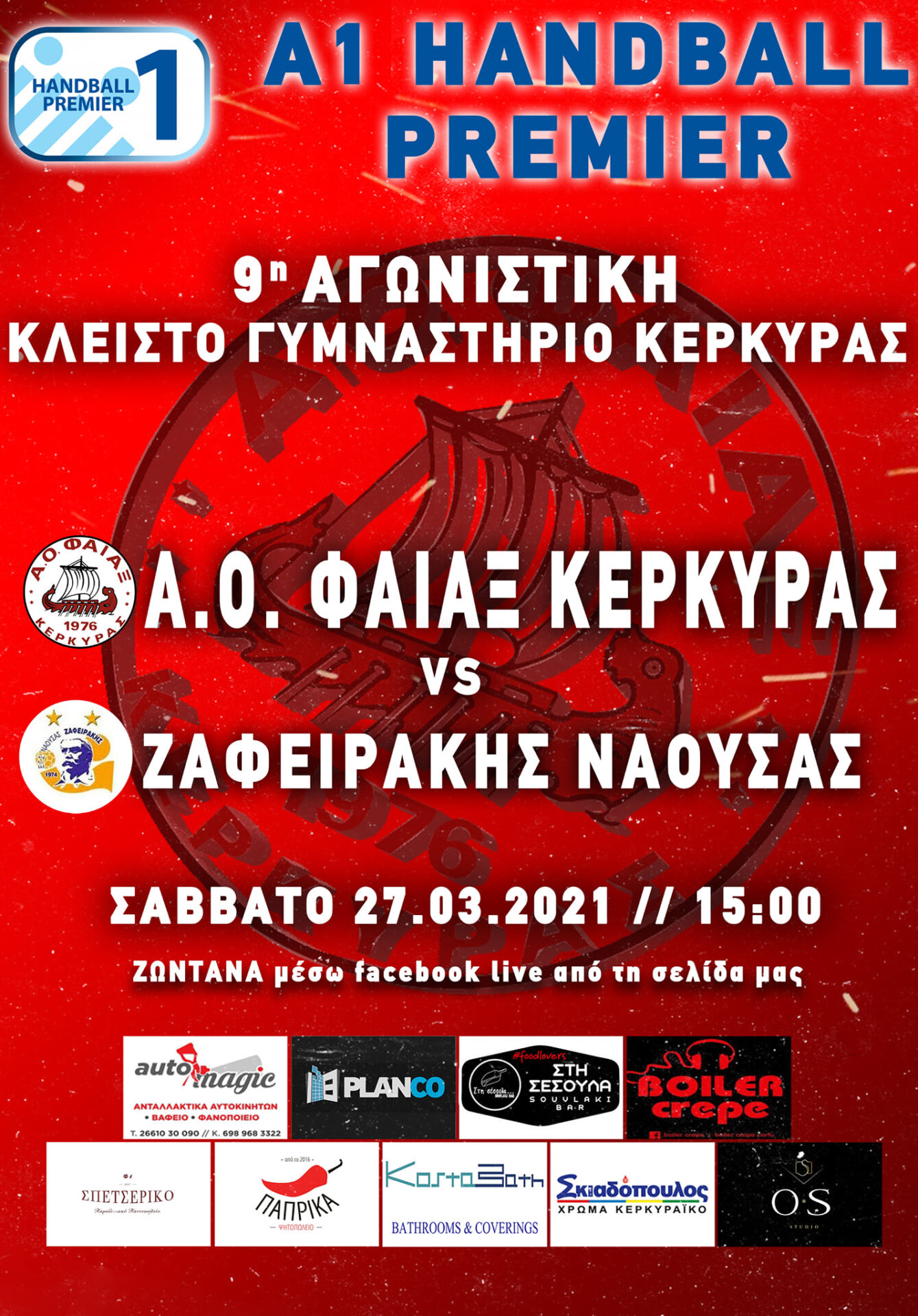 Συνεχίζεται αύριο Σάββατο (27/3) το Πρωτάθλημα της Α1 Handball Premier, με την ανδρική ομάδα του Φαίακα να υποδέχεται στο Κλειστό Γυμναστήριο του ΕΑΚ Κέρκυρας τον Ζαφειράκης Νάουσας.