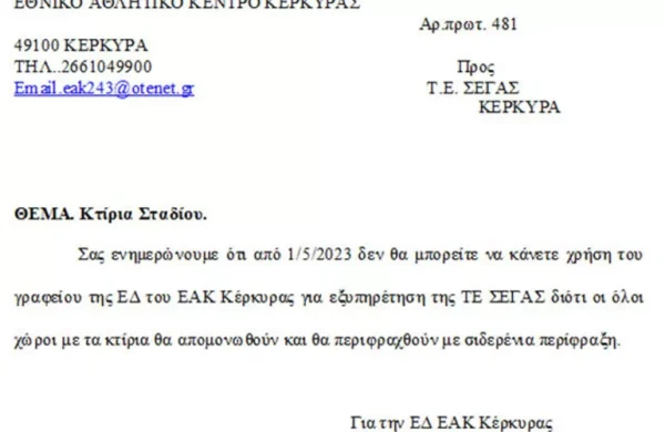 Άλλο πάλι και τούτο! Μετά τα “καινούργιου τύπου” κοντέϊνερ πού ήλθαν χθες Πέμπτη (27/4) στο νησί προκειμένου να εξυπηρετήσουν άμεσα τους αθλούμενους στο ΕΑΚΚ, σήμερα Παρασκευή (29/4) ήρθε στο φως της δημοσιότητας η ακόλουθη ανακοίνωση της νέας Διοίκησης που “εξορίζει” την ΤΕ ΣΕΓΑΣ από τα γραφεία που της είχαν παραχωρήσει οι τέως διοικούντες και εξυπηρετούνταν τα σωματεία- αθλητές του στίβου άμεσα με μια δικαιολογία άκρως φαιδρή!