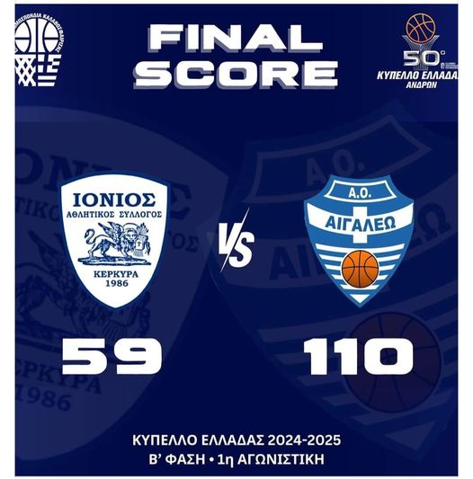 Την ήττα- αποκλεισμό γνώρισε σήμερα Τετάρτη (18/9), η ανδρική ομάδα μπάσκετ του Ιόνιου Κέρκυρας,  από την αντίστοιχη του Αιγάλω, η οποία αγωνίζεται στην National League 1, στα πλαίσια της 1ης αγωνιστικής της 2ης Φάσης του Κυπέλλου Ελλάδας, με σχεδόν double score (59-110)