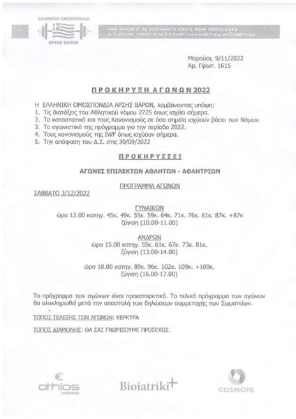 Οι αγώνες, των οποίων την διοργάνωση έχει αναλάβει το σωματείο του Αλκίνοου Κέρκυρας, με Πρόεδρο και προπονητή τον Ηρακλή Ροδίτη, ο οποίος τυγχάνει και Γ΄Αντιπρόεδρος της Ελληνικής Ομοσπονδίας Άρσης Βαρών, θα πραγματοποιηθούν το Σάββατο 3 Δεκεμβρίου, στο Κλειστό Γυμναστήριο του ΕΑΚΚ, με ώρα έναρξης στις 10 το πρωί.