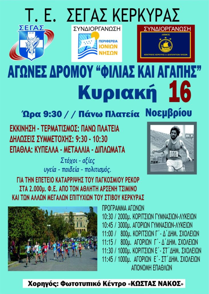 Την προσεχή Κυριακή 16 Νοεμβρίου θα πραγματοποιηθούν οι αγώνες δρόμου “Φιλίας και Αγάπης” που συνδιοργανώνουν ο ΤΕ ΣΕΓΑΣ με την Περιφέρεια και τον Κεντρικό Δήμο και είναι αφιερωμένοι στην επέτειο της κατάρριψης του Παγκοσμίου ρεκόρ από τον Αρσένη Τσιμίνο, στα 2000μ, αλλά και στις σπουδαίες επιτυχίες ,αναλόγως των δυσμενών συνθηκών ,από τους Κερκυραίους αθλητές και αθλήτριες του στίβου