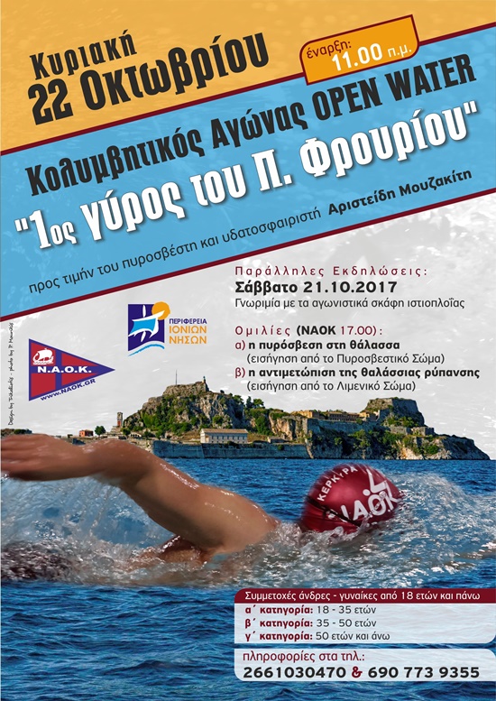 Σε αυτό το πλαίσιο εντάσεται η διοργάνωση του κολυμβητικού αγώνα OPEN WATER «1ος Γύρος του Παλαιού Φρουρίου» την Κυριακή 22/10/17, με σκοπό να τιμηθεί η μνήμη του πυροσβέστη και αθλητή – υδατοσφαιριστή του Ν.Α.Ο.Κ. Αριστείδη Μουζακίτη. Με αφορμή αυτό το γεγονός έχουν προετοιμαστεί για το Σάββατο 21/10/17 [17.30] στο χώρο του Ομίλου παράλληλες εκδηλώσεις που περιέχουν γνωριμία με τους τύπους των ιστιοπλοϊκών σκαφών αλλά και δύο ενδιαφέρουσες διαλέξεις με θέματα: «Η πυρόσβεση στη θάλασσα» και «Η αντιμετώπιση της θαλάσσιας ρύπανσης».