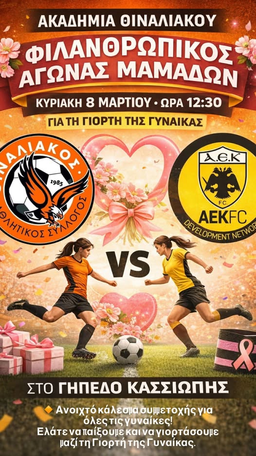 «Η Ακαδημία Θιναλιακού διοργανώνει φιλανθρωπικό αγώνα ποδοσφαίρου μαμάδων την Κυριακή 8 Μαρτίου στις 12:30 στο γήπεδο Κασσιώπης, με αφορμή τη Γιορτή της Γυναίκας.