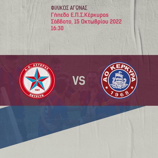 Το προσεχές Σάββατο (15/10), στις 4 και μισή το απόγευμα, στο ενωσιακό γήπεδο, στο Κανόνι, πρόκειται να πραγματοποιηθεί φιλικό τεστ προετοιμασίας ανάμεσα στον Αστέρα Πετριτή και τον ΑΟ Κέρκυρα.
