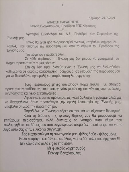 Σήμερα Τετάρτη (24/7) το απόγευμα θα συνεδριάσει η Εκτελεστική Επιτροπή της ΕΠΣΚ, προκειμένου να αποδεχθεί και επίσημα την γραπτή παραίτηση του κυρίου, Γιάννη Βλαχόπουλου , η οποία μάλιστα έχει δει το φως της δημοσιότητας και η οποία αναφέρει τους λόγους που τον οδήγησαν σε αυτήν του την απόφαση , με κυριότερο αυτόν των προσωπικών επιθέσεων που έχει δεχθεί ο ίδιος, αλλά και η οικογένειά του με έωλες , ανυπόστατες και γελοίες κατηγορίες, όπως ο ίδιος γράφει χαρακτηριστικά, καθώς και το νοσηρό κλίμα που καλλιεργήθηκε εις βάρος του από συγκεκριμένο άτομο, με αποτέλεσμα να μην μπορεί να πετύχει και να προφέρει ακόμη περισσότερα, όπως επιθυμούσε ο ίδιος διότι υπήρξε τροχοπέδη στα θέλω του