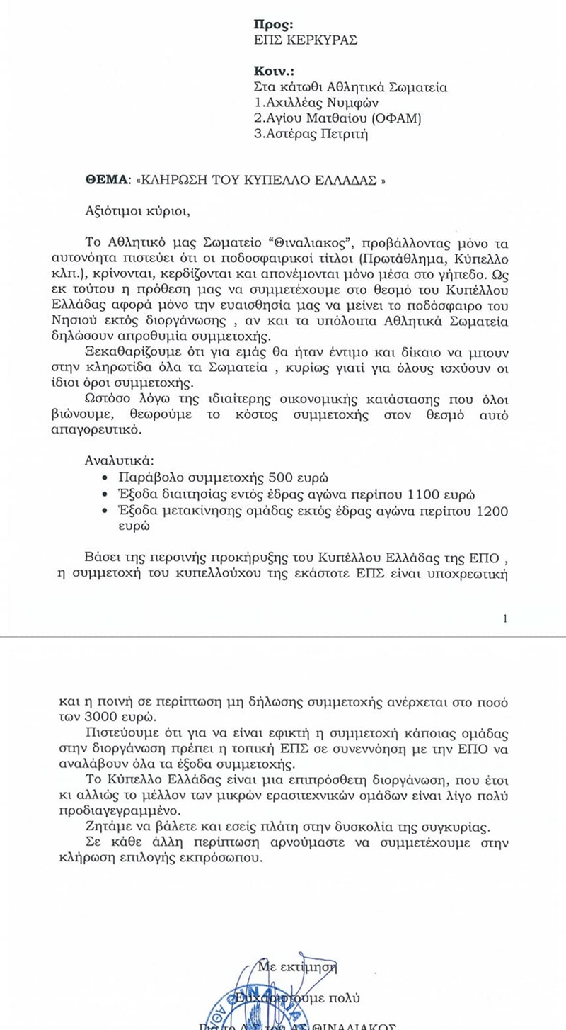 Ο Θιναλιακός Αχαράβης ,μετά την άρνησή του την περασμένη Δευτέρα (1/6) να λάβει μέρος στην κλήρωση του Κυπέλλου, για οικονομικούς κυρίως λόγους, απέστειλε έγγραφο προς την ΕΠΣ Κέρκυρας, που κοινοποίησε και προς τα άλλα τρία συμμετέχοντα σωματεία, με το οποίο εξηγεί υπό ποία δεδομένα θα δεχθεί να λάβει μέρος στην κλήρωση για την ανάδειξη του Κυπελλούχου της Ένωσης, που στη συνέχεια θα συμμετάσχει στο Κύπελλο Ελλάδας.