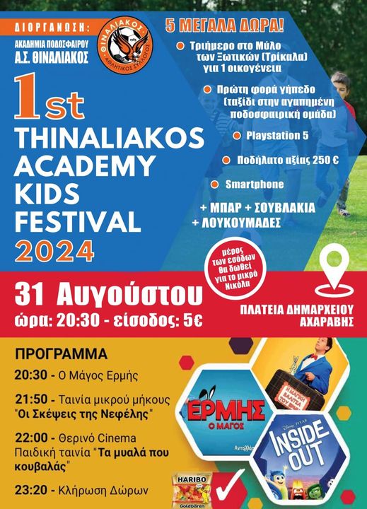 Σε λίγες μέρες και συγκεκριμένα το μεθεπόμενο Σάββατο 31 Αυγούστου θα πραγματοποιηθεί το 1st Thinaliakos academy kids festival , το οποίο διοργανώνει η  Ακαδημία Ποδοσφαίρου του Θιναλιακού, στην Πλατεία Δημαρχείου Αχαράβης με ώρα έναρξης στις 20:30 και  με είσοδο 5 ευρώ.