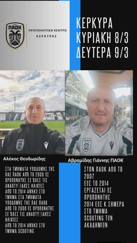 Αρχίζει να παίρνει «σάρκα και οστά» η συνεργασία και η δημιουργία προπονητικού κέντρου της Σχολής «PAOK Academy», στις εγκαταστάσεις του Sfakianakis Football Athletic Club, που είχε γνωστοποιηθεί τον περασμένο Δεκέμβριο, καθώς το διήμερο Κυριακή 8 και Δευτέρα 9 Μαρτιου οι scouters του ΠΑΟΚ, Αλέκος Θεοδωρίδης και Γιάννης Αβραμίδης θα έρθουν στην Κέρκυρα και συγκεκριμένα στο Αθλητικό Κέντρο της ΕΠΣΚ, προκειμένου να αξιολογήσουν, χωρίς κανένα κόστος, όλους τους νεαρούς επίδοξους ποδοσφαιριστές γεννηθέντες από το 2011 έως και το 2016, ανεξαρτήτου ομάδας ή Σχολής που μπορεί ήδη να είναι εγγεγραμμένοι, όπως γνωστοποιούν μεταξύ άλλων οι υπεύθυνοι της κερκυραϊκής Ακαδημίας:
